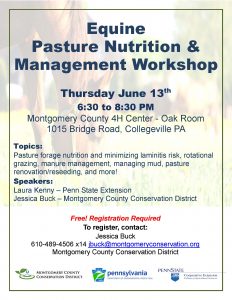 An Equine Pasture Nutrition and Management Workshop will be held Thursday June 13th at the Montgomery County 4-H Center in Creamery, PA. For more information click here.